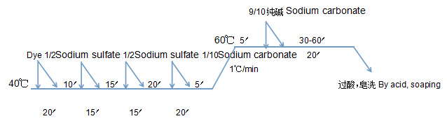 Test process conditions:Dyeing depth 1%;Bath ratio: 1:6;Sodium sulfate: 40g/l;Sodium carbonate:15g/l